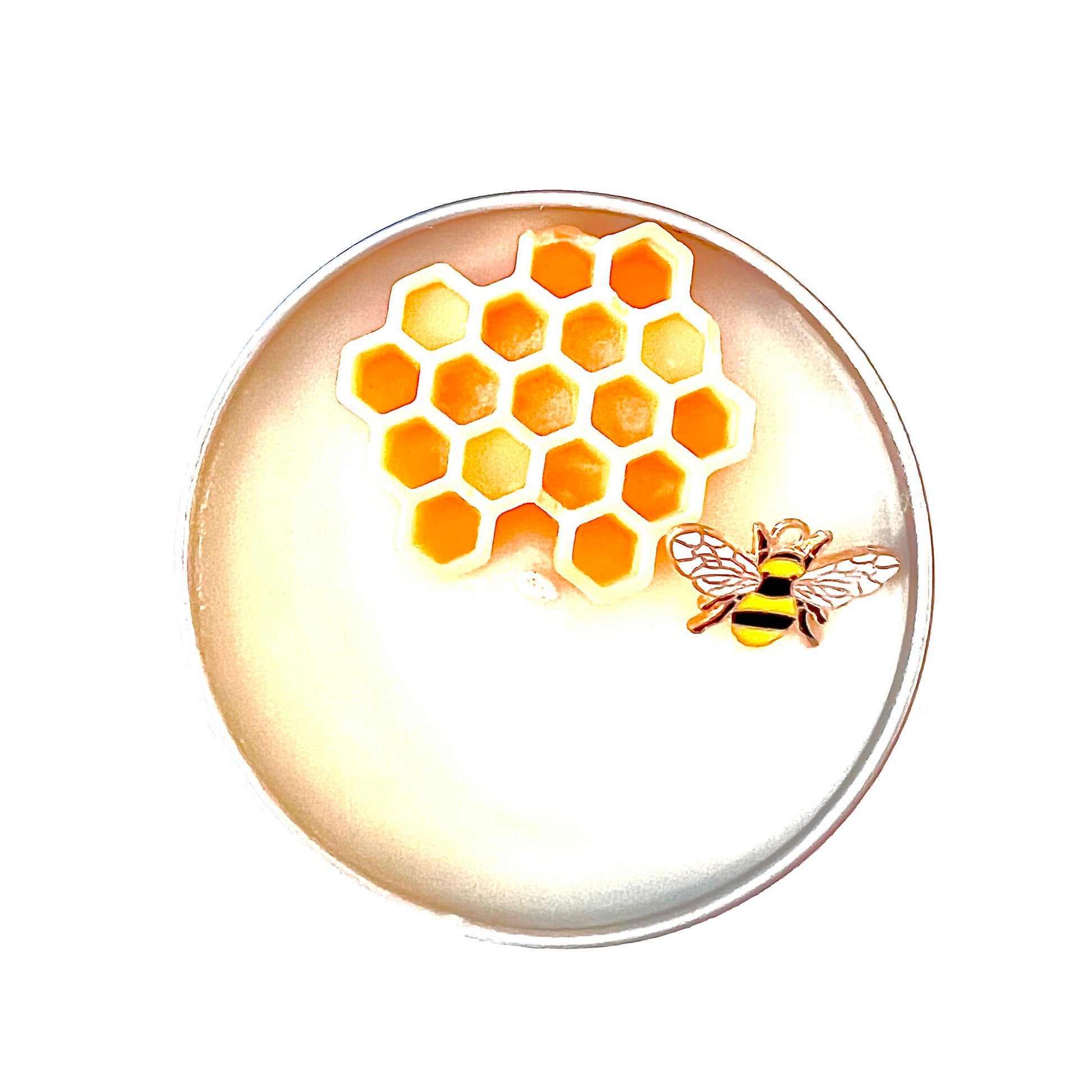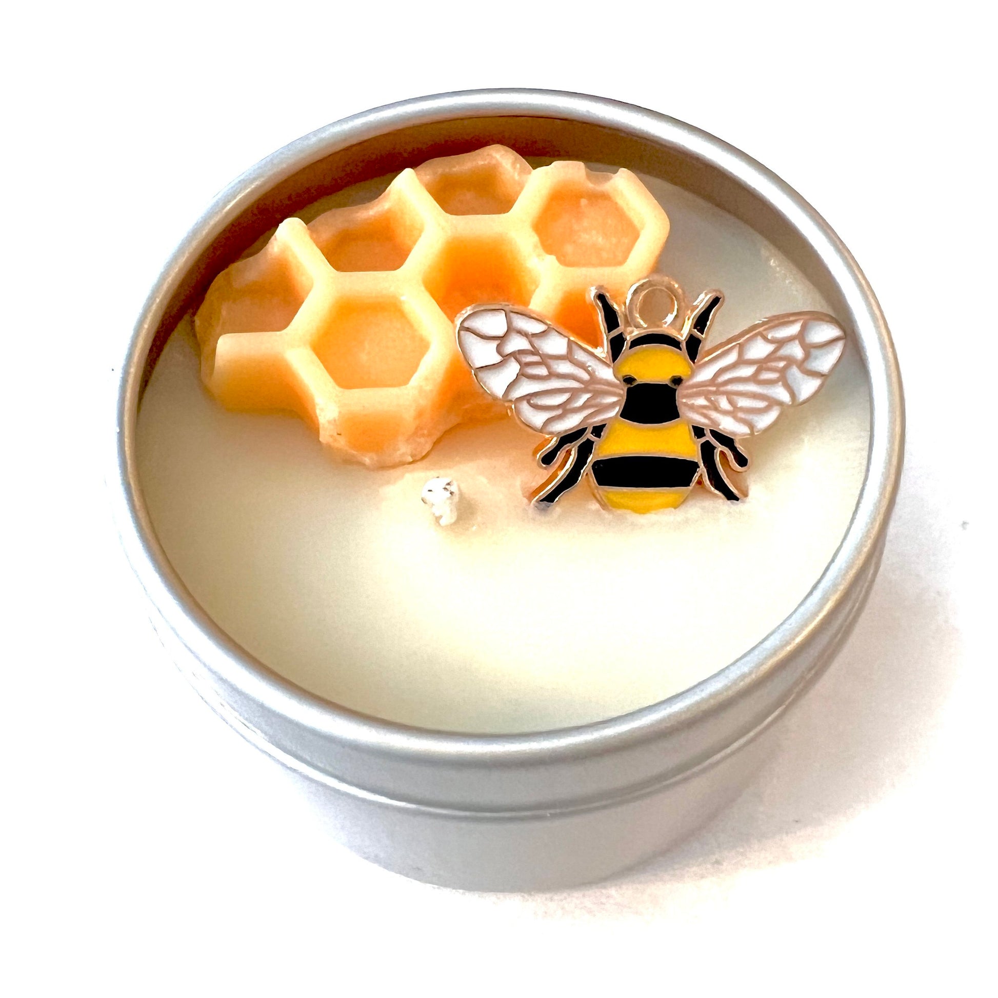 A honeycomb wax melt and an enamel bee charm dress this hand poured soy candle. Scented with notes of spiced honey, Tonka bean and vanilla cream. Reusable bee charm can be attached to a necklace chain, bangle or keychain with just a loop or notion. Made with soy wax, cotton wick and phthalate free fragrance oil. Available in 3 tin sizes, 2, 4 and 8 oz. volumes. Comes with brand label and warning sticker. Candle burn times average 7-9 hours per ounce, dependent on candle care and environment. 2 oz tins measure 2.05 inches wide, 1.38 inches tall. 4 oz. tins measure 2.4 inches wide and 1.8 inches tall. 8 oz. tins measure 3.2 inches wide and 2 inches tall. Trim wick to 1/8 to 1/4 inch, never burn unattended, near drafts or in reach of children or pets. Keep candle free of debris and wick trimmings. Most or all of the embellishments may need to be removed before burning, especially those pieces closest to the wick.