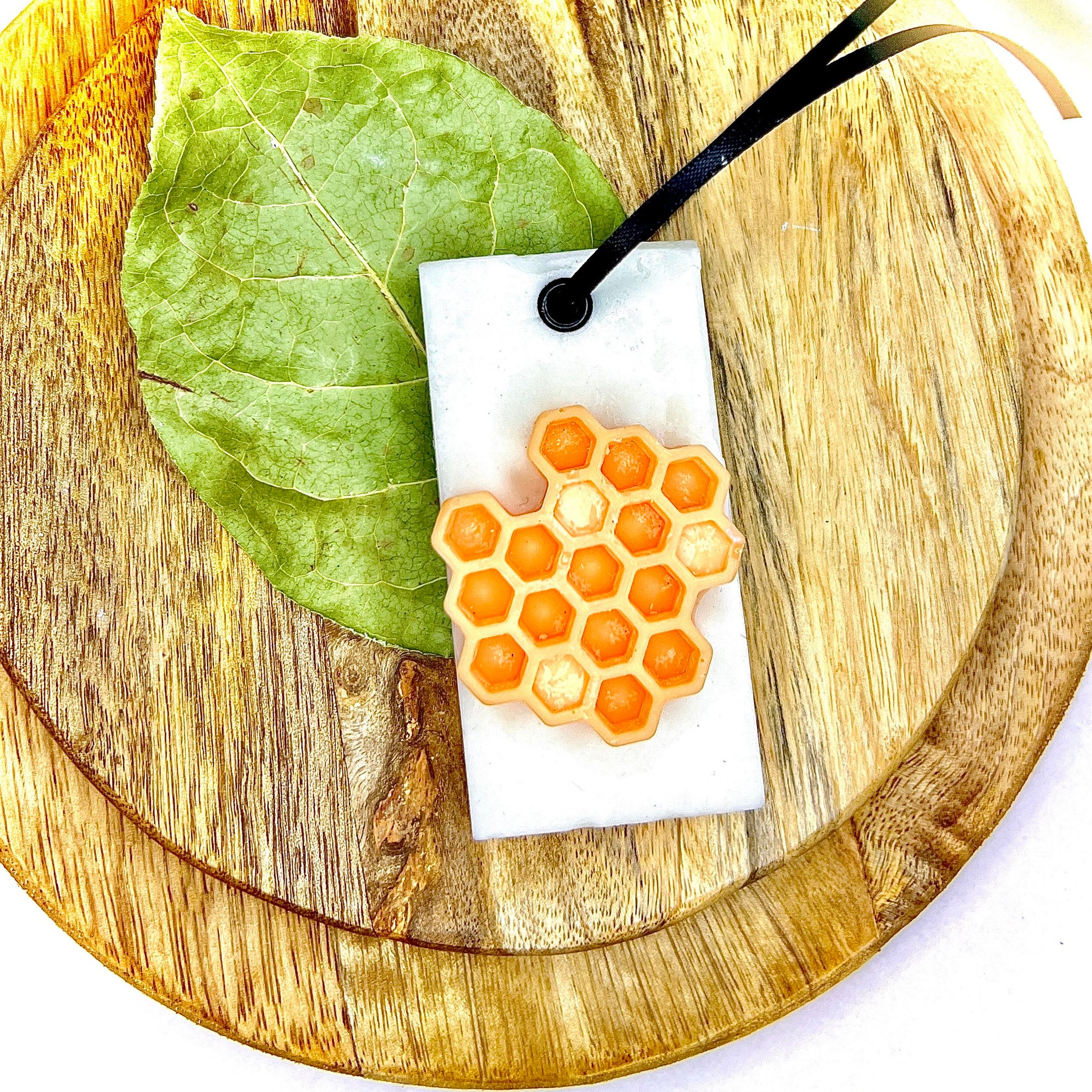 Simply hang this beautifully hand-crafted soy wax sachet in a closet or small room for a clean and non-toxic fragrance. Scented with notes of spiced honey, Tonka beans and fresh sweet-cream. Made with soy wax, non-toxic phthalate-free fragrance and a hand made wax honeycomb. Do not place in direct contact with fabric, as oils may stain. When it loses scent, simply break up into your wax melt warmer for extended use. Packaged in a black box with clear window for display.